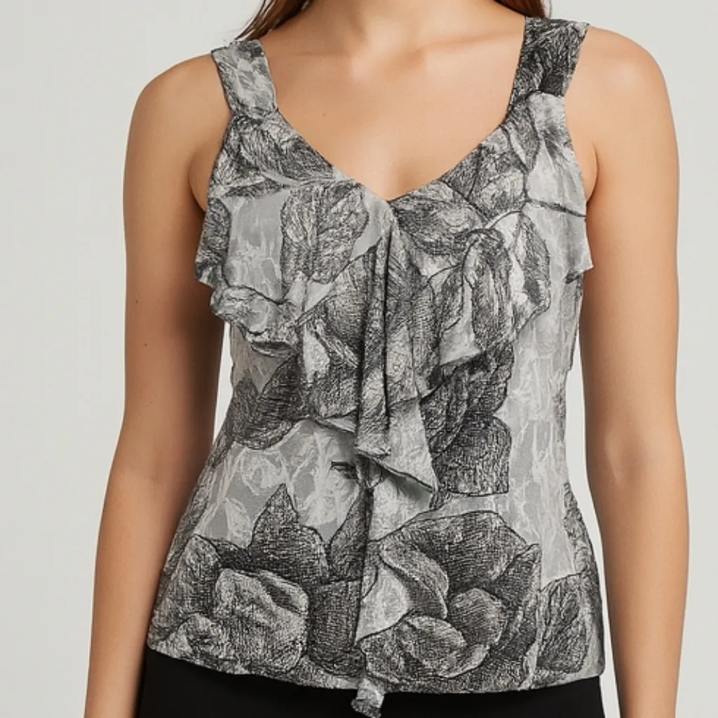 Elegant New York & Company sleeveless top in a soft, lightweight rayon fabric with fluid drape. Features a scoop neckline with cascading ruffle detail at the front and a monochrome floral print that gives it a polished, feminine look. The tailored silhouette skims the body without clinging, making it ideal for workwear or elevated casual styling. Details: Size: Women’s Large Bust: 19" (flat, pit to pit) Length: 27" Fabric: Rayon Style: Sleeveless blouse, ruffle front, floral Aesthetic Keywords: Modern feminine · Office chic · Romantic minimal · Classic workwear · Timeless elegant · Soft tailoring · Polished casual Pairs perfectly with dress pants, skirts, or layered under a blazer for a clean, professional outfit.