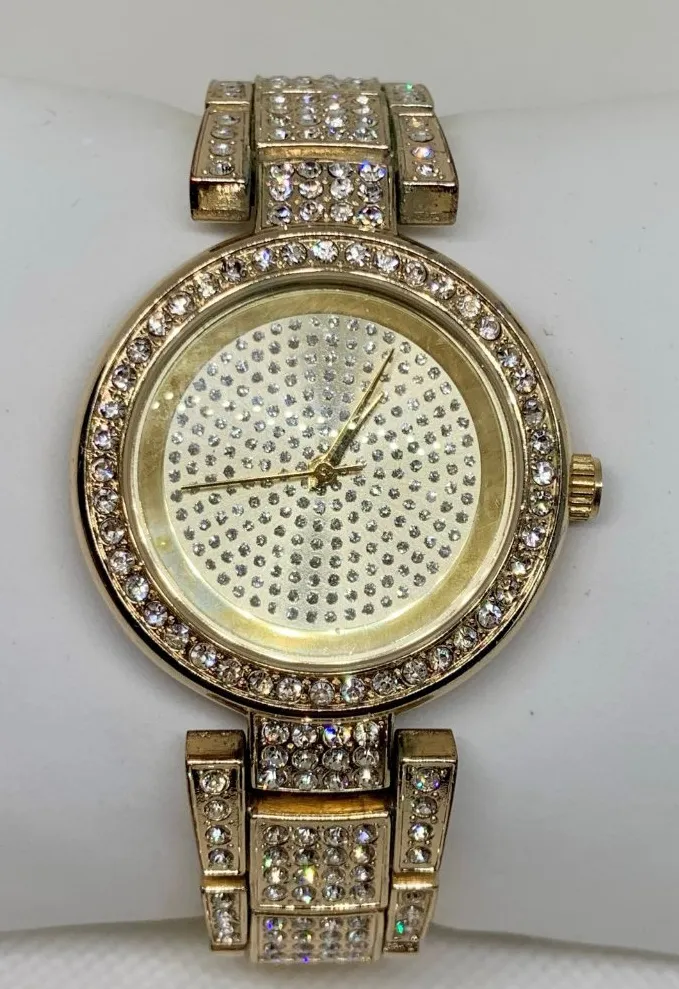 New York & co women gold tone watch iced dial rhinestones 36mm round case quartz analog adjustable links bracelet size up to 7.5” , in good used condition band has some wear works good battery installed