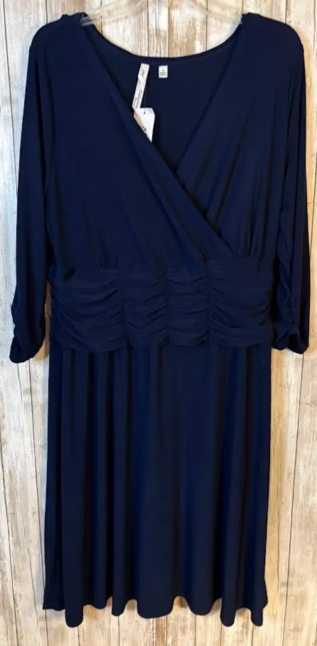 NY Collection Navy A Line Dress Ruching Waist Sleeves Plus Size 1X NWT Approximate flat measurements 22" pit to pit, 19" waist Surplice neckline, 3/4 ruched sleeves $70 retail still available in stores