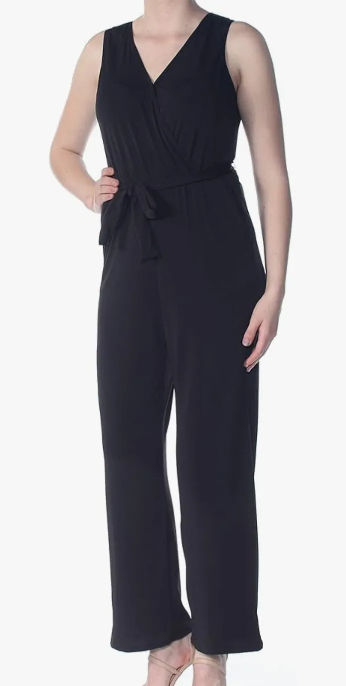 NY Collection Petite Large PL Jumpsuit * Stretch * Sleeveless * Surplice V-Neck with a Single Snap Closure * Tie Belt * Elastic Waistband * Pockets * Black Please check measurements to ensure a proper fit. Bust: 39" Length in the back from the top of the shoulder to the bottom hem: 58" Inseam: 29 3/4" Leg Opening Side to Side: 10 1/2" Measurements are approximate, laying flat and unstretched. Smoke free home.