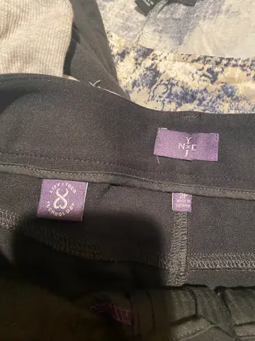 BLACK JEGGINGS skinny jeans with stretch rayon nylon spandex blend vegan leather trim down the sides of legs butt pockets tight ankle fit mall goth vibes lift & tuck technology Brand NYJC size 2p 2 petite modeled on a women’s medium 4 (Eo)