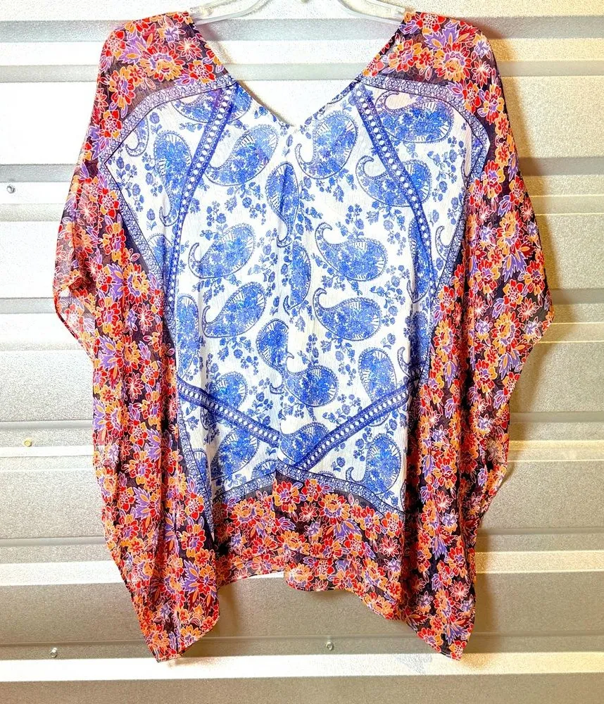 Condition: Excellent pre-owned condition, no stains or flaws, lightweight chiffon Key Features: • Sheer chiffon fabric with boho paisley and floral prints • Flowing, oversized silhouette for comfort and style • V-neckline with wide caftan-style sleeves • Easy popover design, perfect for layering • Lightweight and breathable Measurements (flat lay): • Pit to Pit: 24” • Length: 28” • Sleeve (shoulder to high opening): 10” #depop #bohostyle #festivaloutfit #vintagelook #sheertop