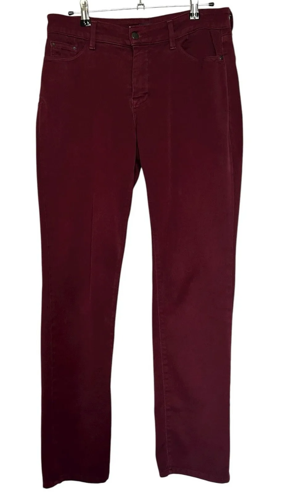 These NYDJ Legging Jeans in burgundy red are a stylish addition to any woman's wardrobe. Made in the USA from a comfortable cotton blend denim, these jeggings feature a straight leg fit with a mid-rise waist and a classic 5-pocket design. The stretch material ensures a comfortable and flattering fit, while the solid red color adds a pop of color to any outfit. With a zip closure and button accents, these jeans are perfect for all seasons and can be machine washed for easy care. Perfect for a casual day out or a night on the town, these NYDJ jeans are a versatile and fashionable choice. These are incredibly soft! Waist 33" Rise 10" Inseam 30"
