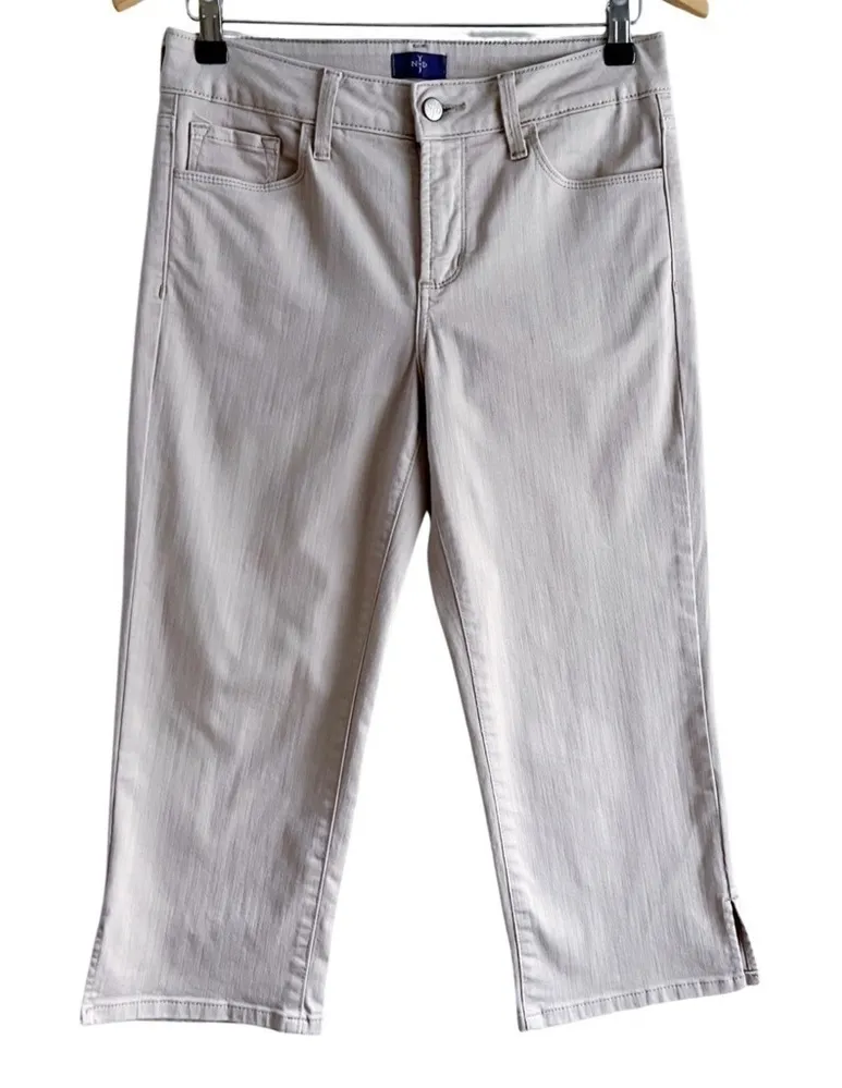 NYDJ Mid-Rise Crop Jeans Pants in Cream, Size 2 (28x20) Crop Pants by NYDJ, featuring a mid rise, fitted cropped leg with small slit on hem side, lift/tuck technology, 98% cotton 2% spandex denim material. Color: cream. Approx. Flat Measurements: Waist: 15” Rise: 9.5 Inseam: 21” Leg opening: 7” • Excellent preowned condition • Smoke & pet-free environment • Next-day shipping • Accepting Offers #G5E7b926