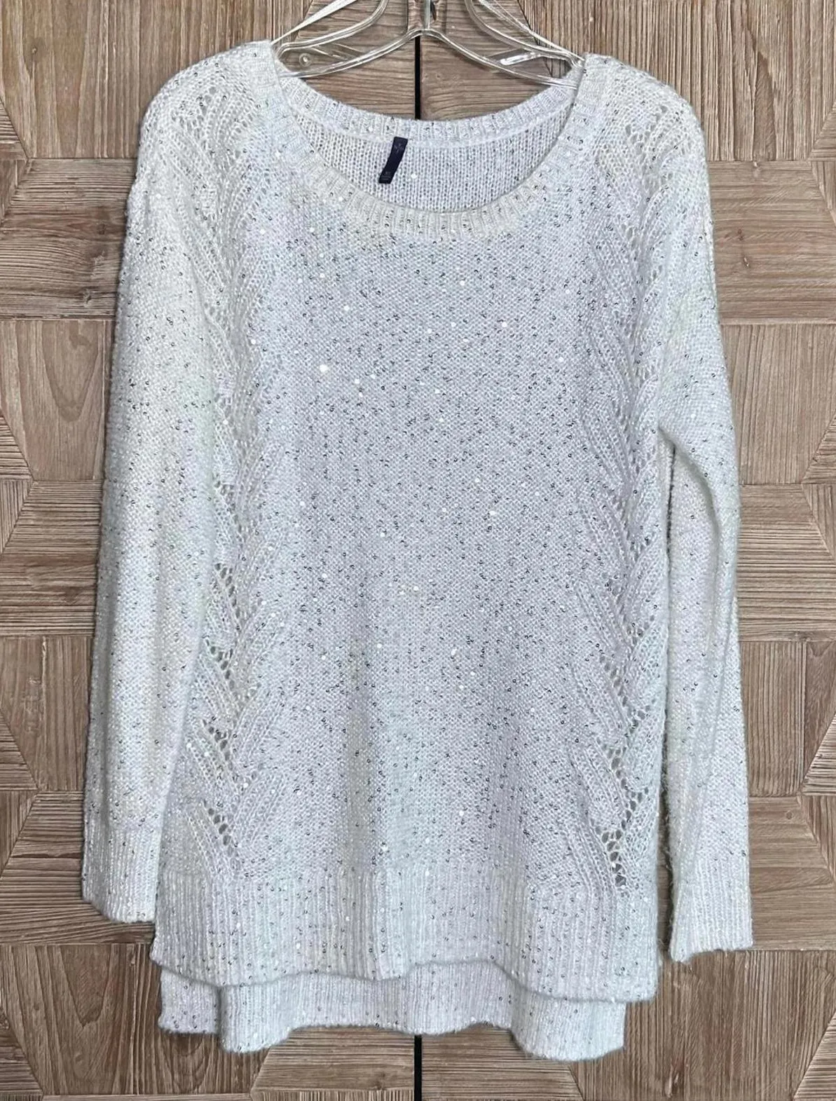 EUC NYDJ knit long sleeve sweater in white with sequin embellishments - Features a round neckline and long sleeves - Intricate knit pattern with cable details - High-low hem Measurements Lying Flat: PTP: 21" Length: 28-30" Sleeve: 23"
