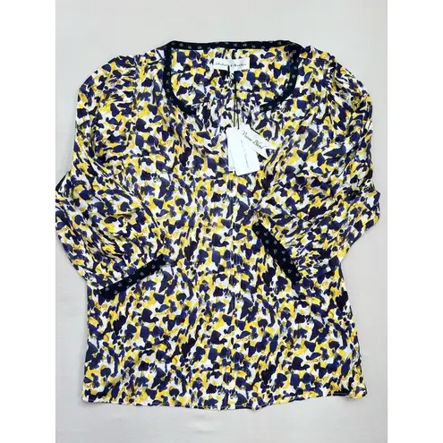 Chelsea Theodore Blouse Womens Size L Yellow Navy Blue White Abstract Print V-Neck Artistic Flowy C... Show more