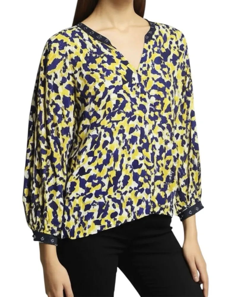 Chelsea Theodore Blouse Womens Size L Yellow Navy Blue White Abstract Print V-Neck Artistic Flowy Condition: New condition. No flaws Size: L Material: 100% Viscose Features: Abstract print, V-neck, 3/4 length sleeves, Contrasting trim, Paintbrush strokes, Multicolor, Pullon style, Relaxed fit, Lightweight Measurements: approximately - AI model used to show potential fit Sleeve length 18.5” Chest width 20.5” Total length 27” Smoke Free Environment Ships next business day Tags: casual, vacation, modern, bohemian, relaxed, bold print, spring, summer, everyday wear, flowy, soft, lightweight, brushstroke