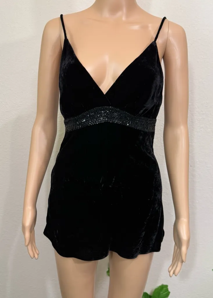 Stunning black velvet dress with a deep V-neck and sequin detailing. Perfect for evening events. El... Show more