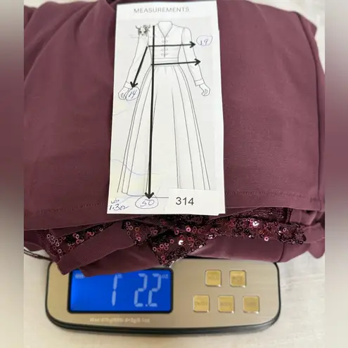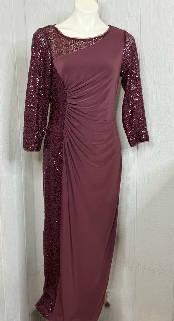Chic burgundy dress with sequin sleeves. Elegant ruched detail. Ideal for evening events.