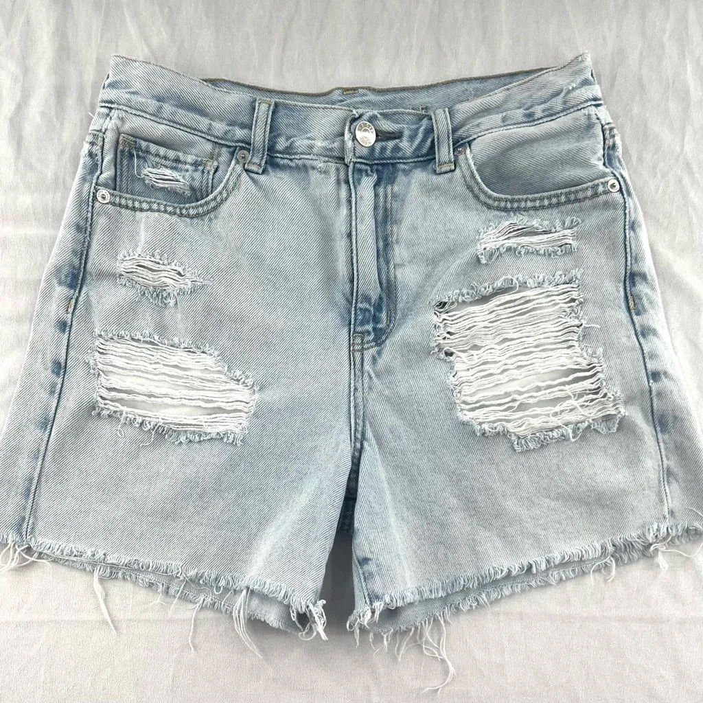 Trendy light wash jean shorts with ripped details. Ideal for casual wear.