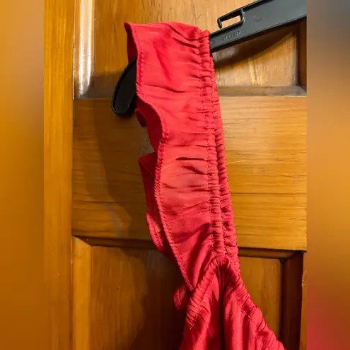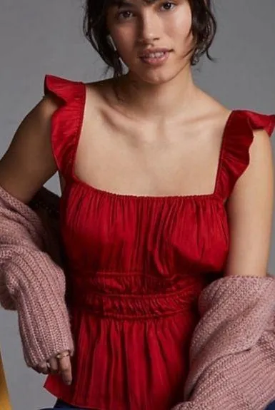Red Anthropologie tiered tank top Women's size Large petite Ruched satin fabric with ruffle straps... Show more