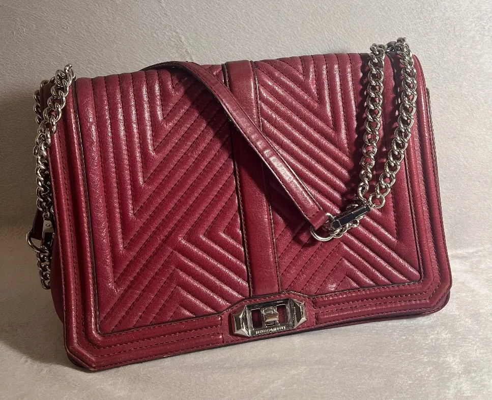 Description; Authentic Rebecca Minkoff Love Crossbody Bag in burgundy quilted leather with a chevron... Show more