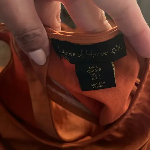 Gorgeous satin midi orange dress from House Of Harlow. Comes with small button closure around the back neckline Sleeveless High neckline Ruched on the side In great condition Measurement: Length: 49 in Pit to pit: 15 in Waist: 15 in (laying flat)