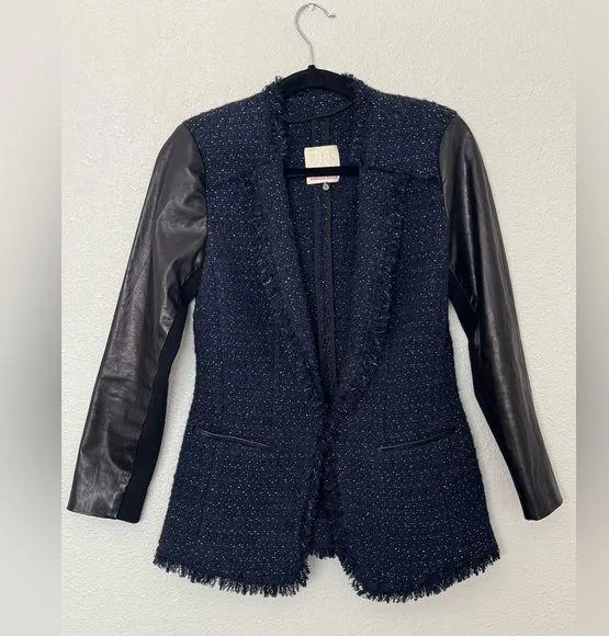 Size 4 Style 713530J690 Navy wool tweed silver specs throughout Black genuine lamb leather sleeves Stretch panels on sleeves Single hook closure Pockets at front trimmed in leather Fringe hems and collar Good pre-owned condition