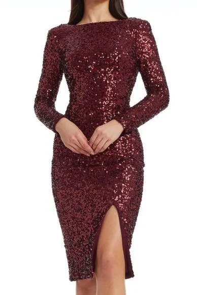 Dress The Population. Erin Dress. Size: Medium Color: Port - Burgundy Brand new with tags in new condition Feel stunning in this long‑sleeve midi featuring a figure‑flattering cowl back and sultry front slit. Expertly crafted with sequin detailing in a rich “Port” hue, it’s designed to balance sophistication and sparkle—perfect for wedding guests, cocktail events, or date nights. Approximate Lay Flat Measurements Waist: 13.5" Under arm to under arm: 17" Length from top shoulder: 44.5"