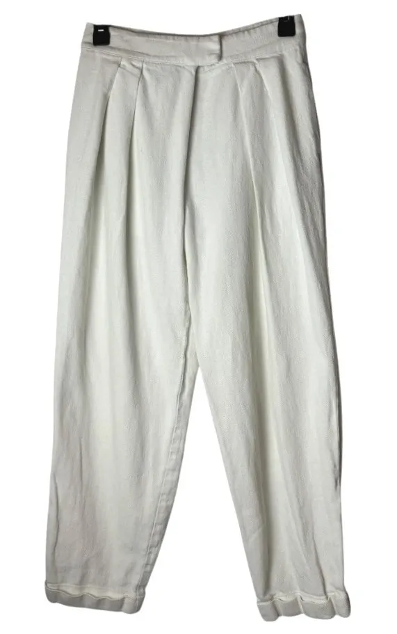 Ivory linen blend high-waisted trousers. Pleated front detailing creates a relaxed, tapered leg silhouette with a sophisticated draped crossover waistband. Features belt loops, side slash and a single back pocket, and a unique cuffed hemline for a touch of understated elegance. Great Pre-Owned Condition (see pics for details) Measurements: waist side to side 13 in, rise 12 in, inseam 26 in, length 36 in All offers welcomed! ❤️ Professional seller, smoke free home and same or next day shipping. Like items for price drops. Receive the 30% off bundle discount when you purchase two or more items. designer, linen, linen blend, pleated, pleats, baggy, relaxed, Y2K, retro, chic, Minimalist, Stretch, Curvy, Casual, Classy, High Rise, High Waisted, High Waist, trendy, stylish, chic, streetwear, hipster, edgy, urban, Designer, Luxury, trendy, Classic, Women's, Womens, 80s, 90s, retro, vintage look, vintage inspired, tapered, cropped, crop, ankle, Baggy, Small, S,
