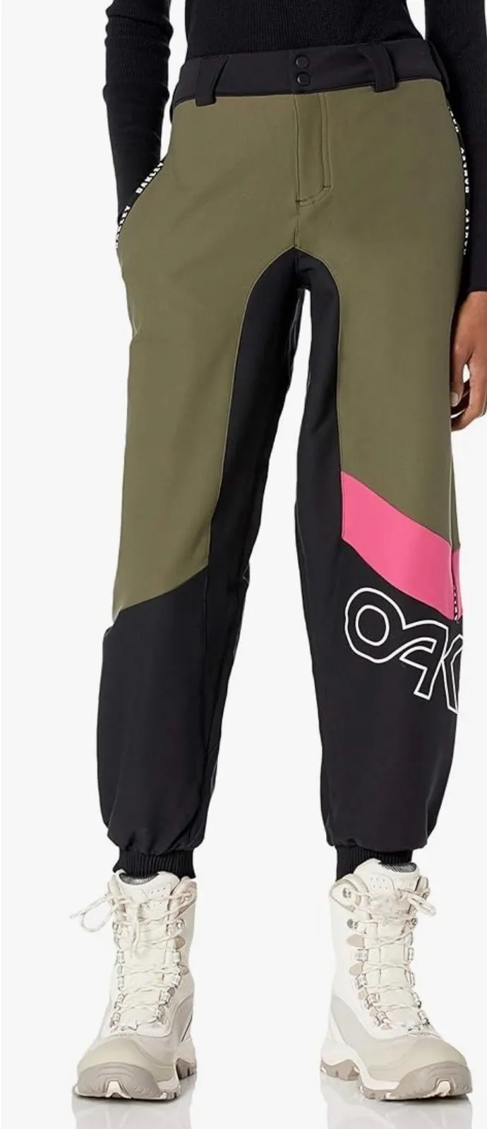 Conquer the slopes with these Oakley performance fit ski and snowboard pants, designed for both style and functionality. The striking color-block design featuring olive green, black, and a vibrant pink accent panel, along with the bold Oakley logo, ensures you stand out on the mountain. Thoughtful details like a zippered back pocket provide secure storage for essentials, while the elasticated cuffs ensure a snug fit boot. Measurements: • See pictures Style: Snow Pants Type: Pants Department: Women Theme: Colorful Features: Adjustable Waist, Elastic Waist, Water Resistant Performance/Activity: Skiing, Snowboarding Fabric Type: Woven Season: Winter Material: 100% Nylon Closure: Button Occasion: Activewear Pattern: Colorblock Keywords: Oakley pants, ski pants, snowboard pants, winter sports, performance wear, color block, athletic apparel, outdoor gear, active lifestyle, mountain apparel, snow gear, logo detail