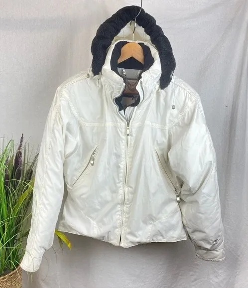 Great pre owned Very clean but not perfect….it’s white! We found no flaws worth noting Style: Venus with fur # 06129 100% polyester 100% nylon lining Poly filled Machine washable Zip front close Attached sunglasses cleaning cloth Adjustable inner waistband toggles Inner sunglasses zip chest pocket Zip off hood has fur edge & drawstrings Arm pocket with metal charm accent Zip expandable sleeve cuffs Inner black & gray attached inner cuffs 23” length 44” chest