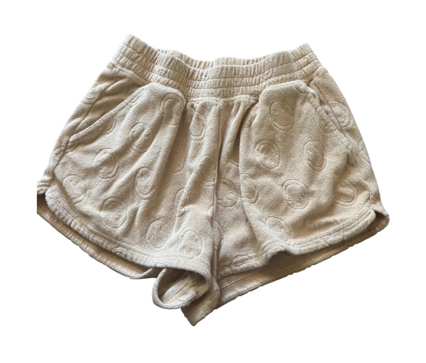 Style: Sweat Department: Women Fabric Type: French Terry Material: Cotton Blend Theme: Cartoon, Cute Occasion: Casual Character: Smiley Face Accents: Embroidered, Logo Pattern: Spotted Features: Pockets, Elastic Waist Performance/Activity: Loungewear, Yoga, Beach Fit: Relaxed Keywords: Out From Under, Smiley Face, Terry Cloth, Lounge Shorts, Womens, XS, Beige, Comfortable, Casual, Summer, Vacation, Sleepwear, Relaxed Fit, Embroidered, Cute
