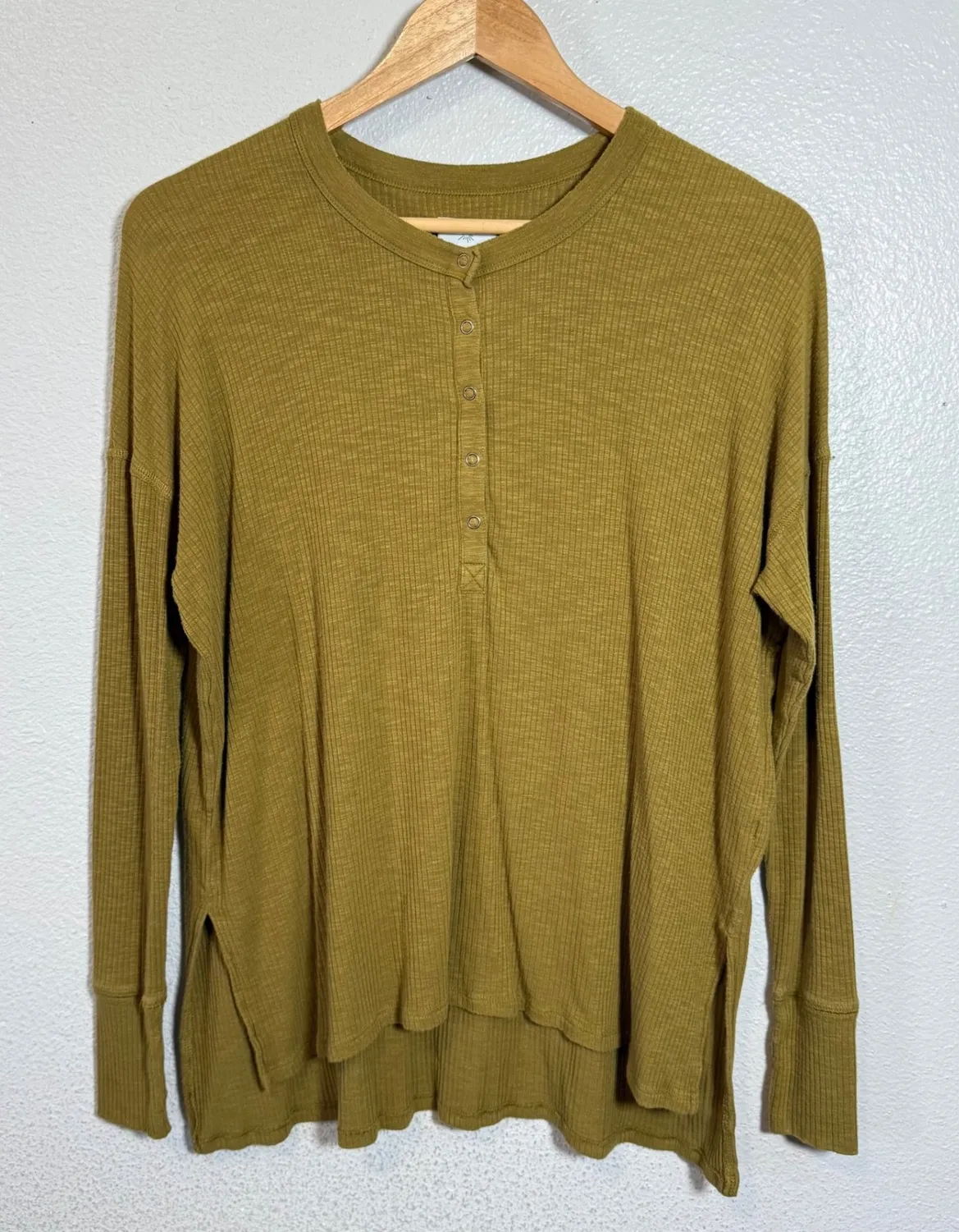 Olive green waffle knit henley long sleeve shirt from OFFLINE by Aerie. Features a button-up neckline with multiple buttons for adjustable styling. The shirt has a relaxed fit with a high-low hemline and side slits for added detail and ease of movement. The cuffs are finished with a banded detail. This comfortable and versatile top offers a classic yet modern silhouette. Gently used in good condition Approximately measurements Chest 23" Length 25" 28" Keywords: waffle knit, henley shirt, long sleeve, olive green, relaxed fit, high low hem, side slits, casual top, athleisure, loungewear, basic tee, layering piece