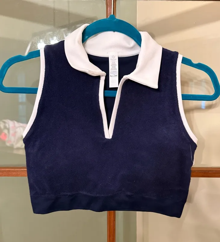 Chic purple crop top with white collar and trim, and sleeveless design. Perfect for casual outings.... Show more