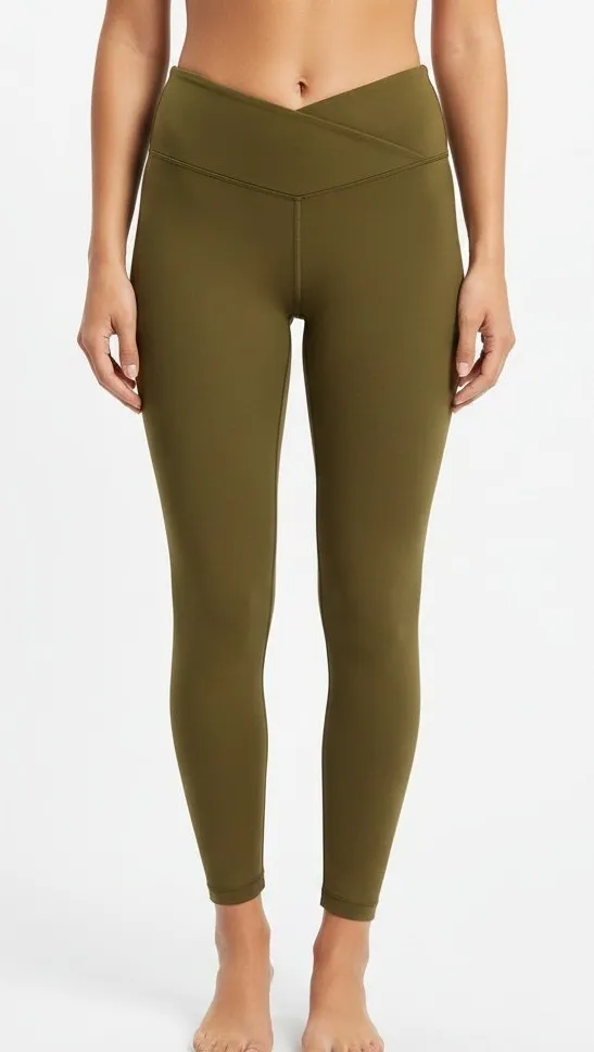 High rise Pull-on elastic waistband Smooth knit fabric Stretch Slim fit Polyester elastane blend Ankle length Solid pattern 7/8 length Buttery soft feel Athleisure Activewear Gym Fitness Minimalist Neutral Yoga Approx. Measurements: Waist (straight across): 10.5" Rise: 10.5" Inseam: 24"