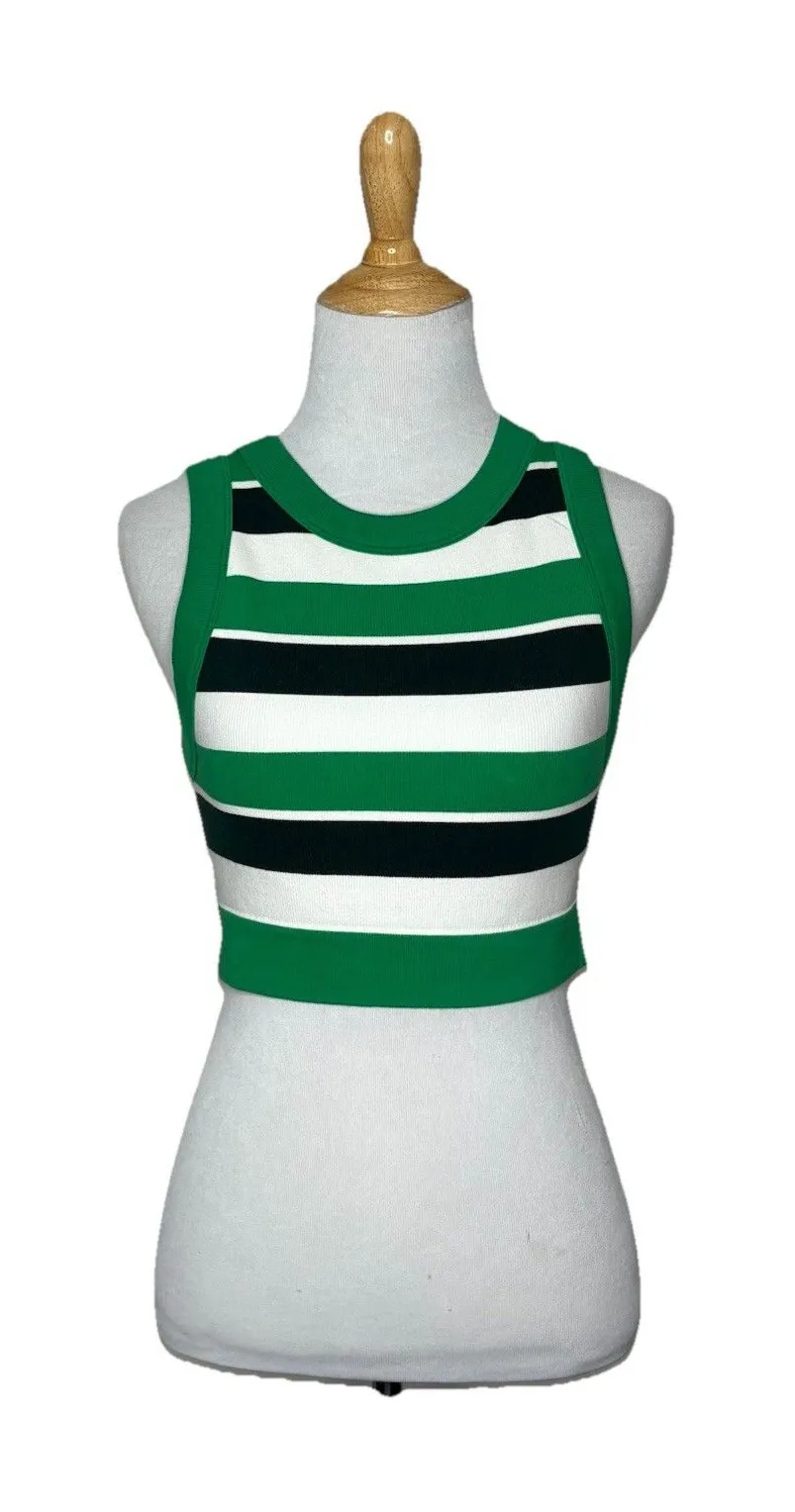 New. Green, white, and black striped. High neck. Fitted. Stretch. Approx measurements laying flat:... Show more