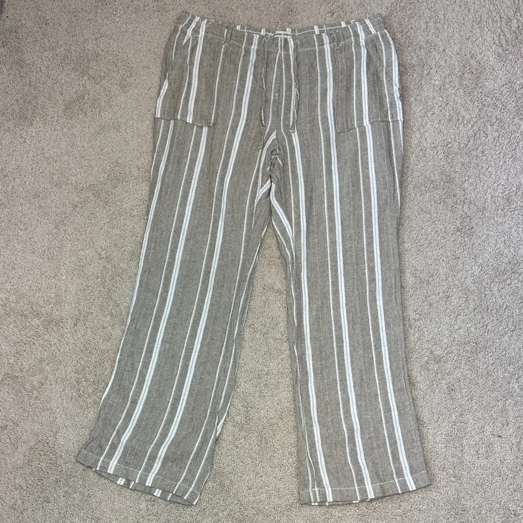 Alexander Jordan - Comfortable linen pants with tan and white stripes. Perfect for casual wear. Pull on with an elastic waist and drawstring. Real hip and rear pockets. Women's size XL 55% Linen; 45% Viscose Waist - 17" Inseam - 28" Leg Opening - 9" ***Approximate measurements taken laying flat