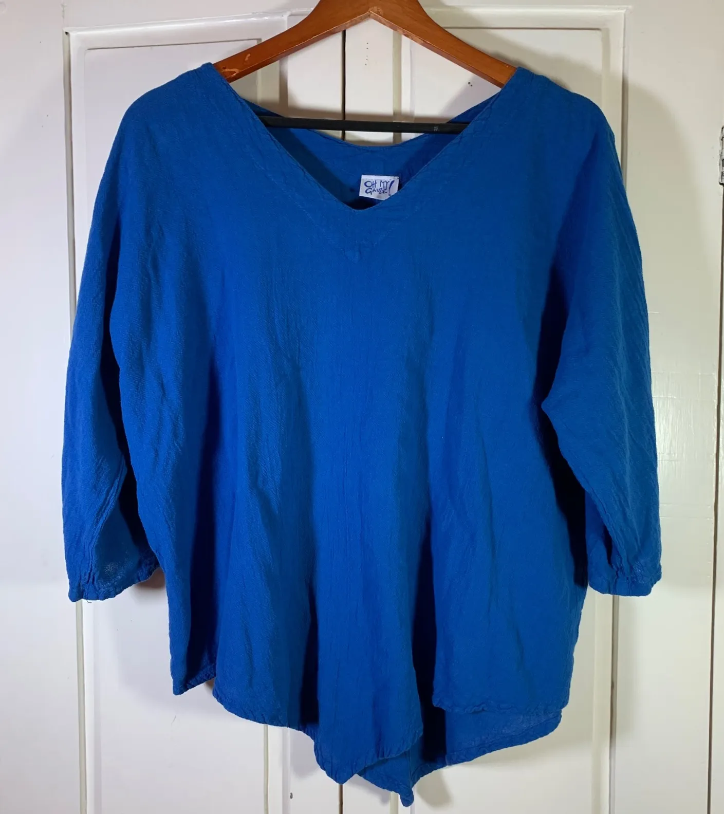 Classic and breezy, this cotton gauze top from Oh My Gauze offers relaxed comfort and effortless style. The vibrant royal blue hue complements the textured gauze fabric, while the flattering V-neckline and three-quarter sleeves create a casual yet refined look. Its lightweight and breathable construction makes it perfect for warm weather. The top features an asymmetrical hemline, adding a touch of uniqueness to the overall design. Ideal for relaxed weekends, casual outings, or vacation wear. Color: Blue Type: Blouse Department: Women Style: Tunic Material: Cotton, 100% Cotton Neckline: V-Neck Sleeve Length: 3/4 Sleeve Sleeve Type: Classic/Fitted Sleeve Pattern: Solid Features: Lightweight, Breathable, Asymmetrical Hem, Easy Care, Coastal Cowgirl Fit: Relaxed Keywords: Oh My Gauze, Women's Top, Gauze Top, Royal Blue Top, Cotton Top, V-Neck Top, 3/4 Sleeve Top, Bohemian Style, Casual Top, Lightweight Top, Size 3, Summer Top, Vacation Wear