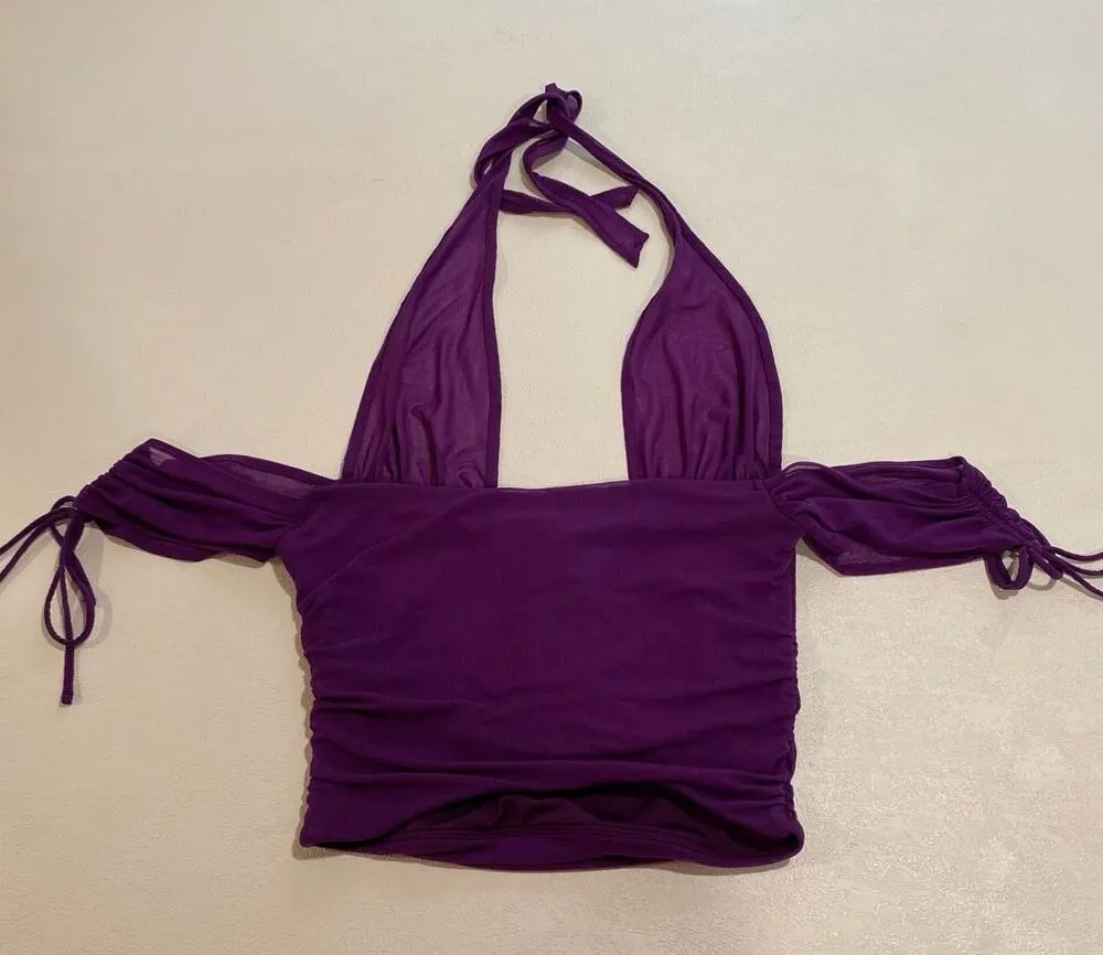 Oh Polly halter crop top in a rich purple hue. Features ruched mesh fabric, adjustable tie halter ne... Show more