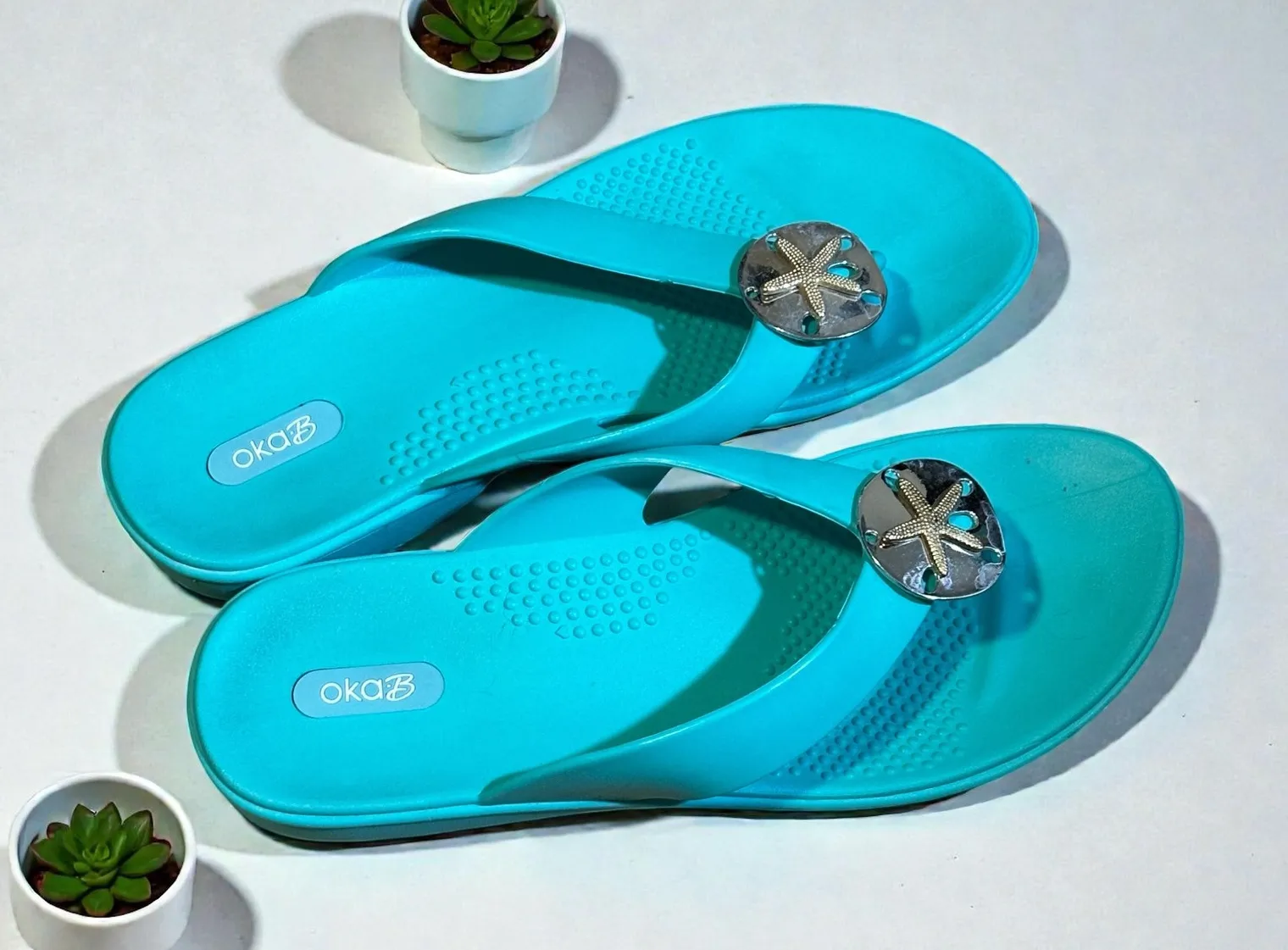 Fits like a 9 - labeled M/L Style: Flip Flop Department: Women Upper Material: Rubber Heel Style: Flat Features: Comfort, Arch Support, Water Resistant, Slip Resistant, Non-Slip Closure: Slip On Pattern: Solid Accents: Medallion, Stone Heel Height: Flat (Under 1 in) Type: Sandal Keywords: OkaB, turquoise, starfish, beach, pool, vacation, comfort, thong sandals, summer, casual, waterproof, slip on, embellished This item is in good preowned condition. It comes from a non-smoking, pet-free home. • Kindly review all photos carefully before purchasing. • Quick Shipping ! Same or Next Day! • Fabric tags shown in photos If still attached • All measurements are take unstretched and are APPROXIMATE