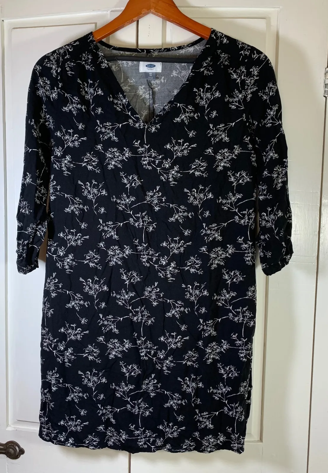 Old Navy Black Floral V-Neck Shift Dress XS Long Sleeve Rayon Boho Minimalist