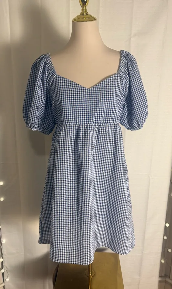 Old Navy blue and white gingham babydoll dress featuring a stretchy smocked bodice and puff sleeves.... Show more