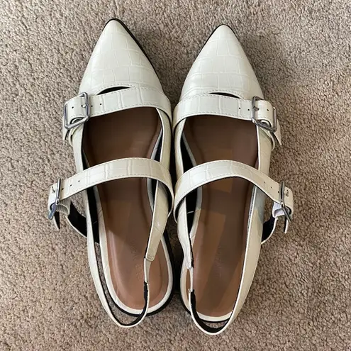 Faux patent snake pointed toe buckle flats in cream color, size 8. Worn once.