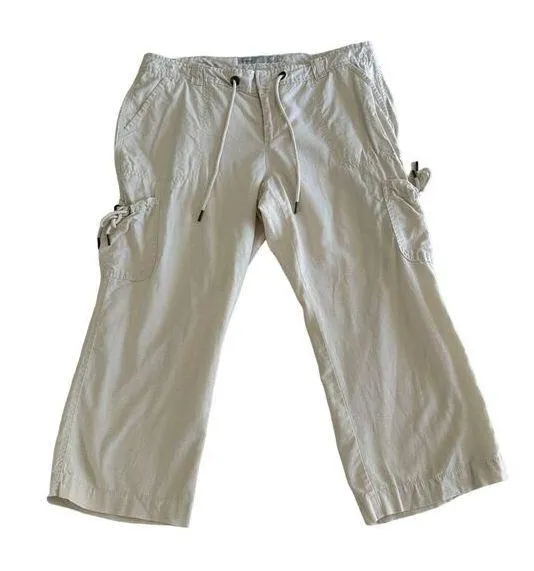 Old Navy Cropped Cargo Pants Womens Size 14 Beige Linen Blend Pockets Mid Rise Casual Zip snap butt... Show more