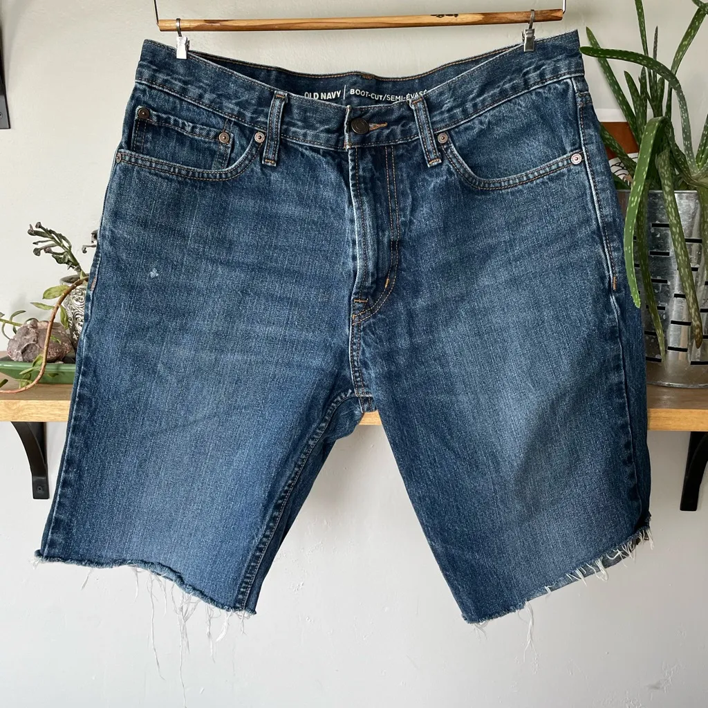 Old Navy long denim jean shorts. Men’s size 32. Waist 17”, rise 10.5”, inseam 10”. One small hole by... Show more