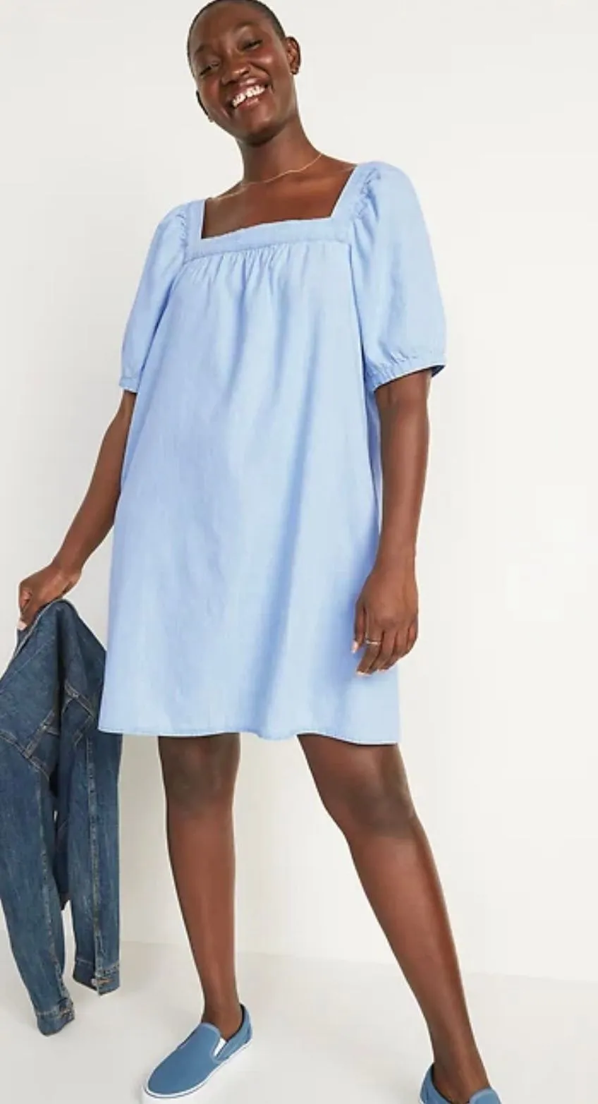 From Old Navy....Darling denim dress in a chambray color. Sized small, this dress has a flattering s... Show more