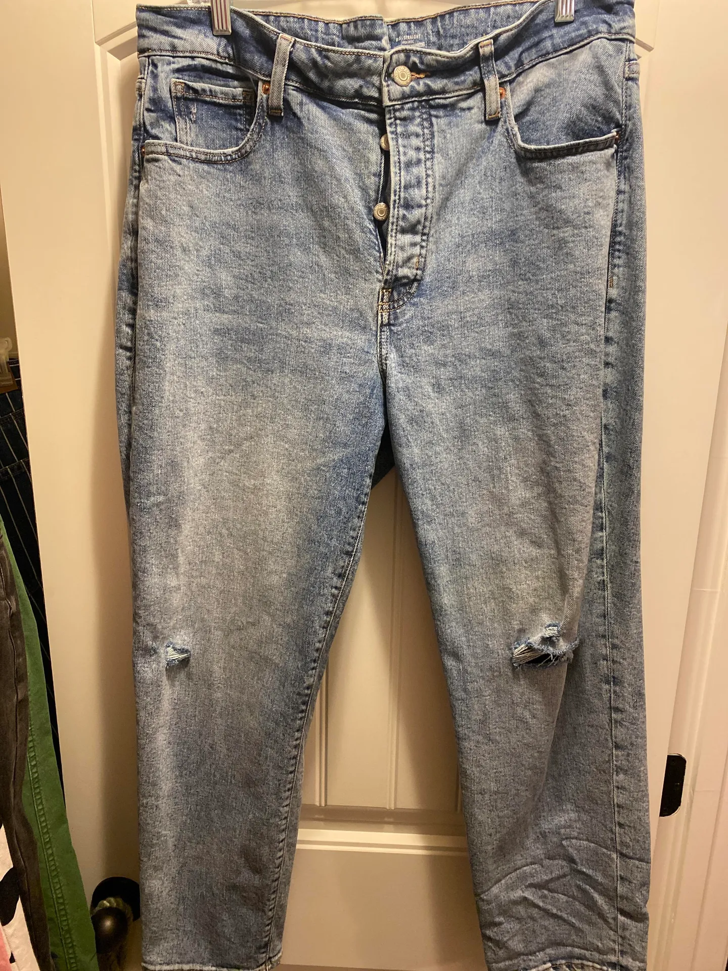 Super comfy and stretchy. Distressing on knees button fly