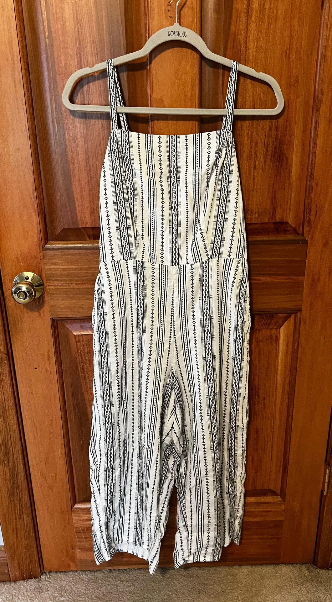 Black and white jumpsuit Size M Adjustable straps Legs cute off near ankle Only worn a couple tim... Show more