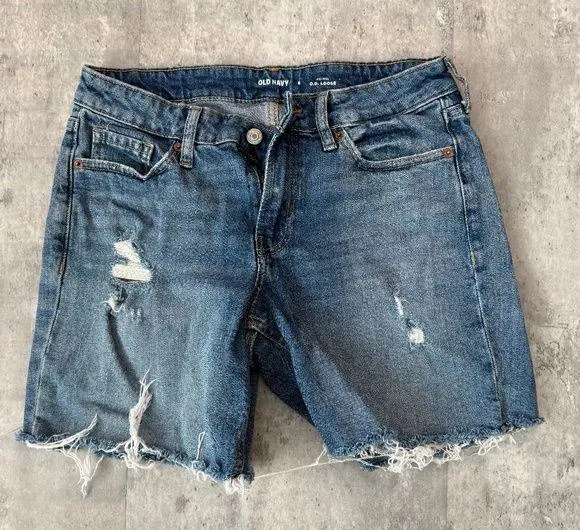 Cute old navy denim shorts, mid rise, distressed. Tagged size 6, see photos for measurements. Tags... Show more