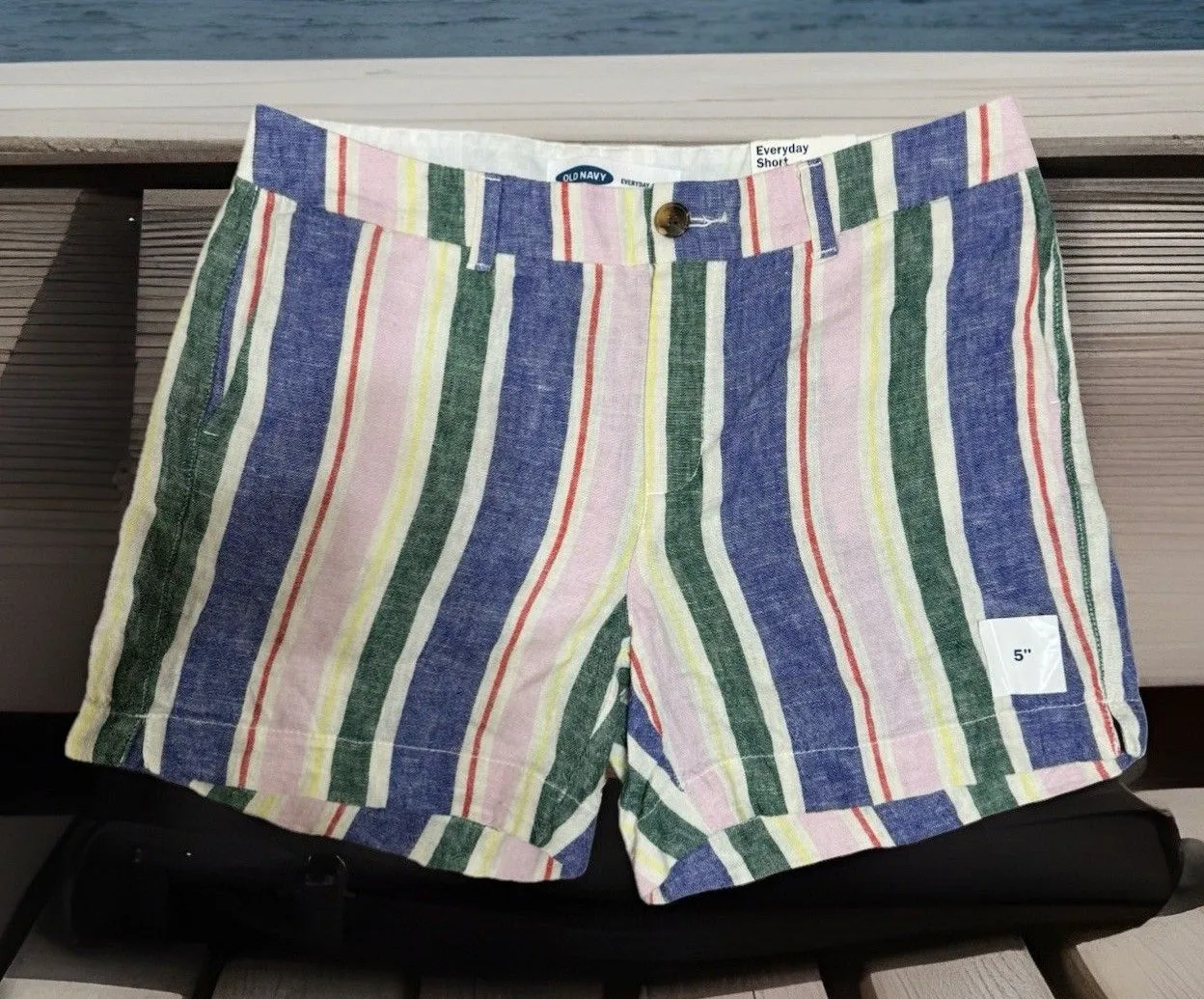 These NWT Old Navy linen shorts in size 10 feature a colorful striped pattern in blue, pink, green,... Show more