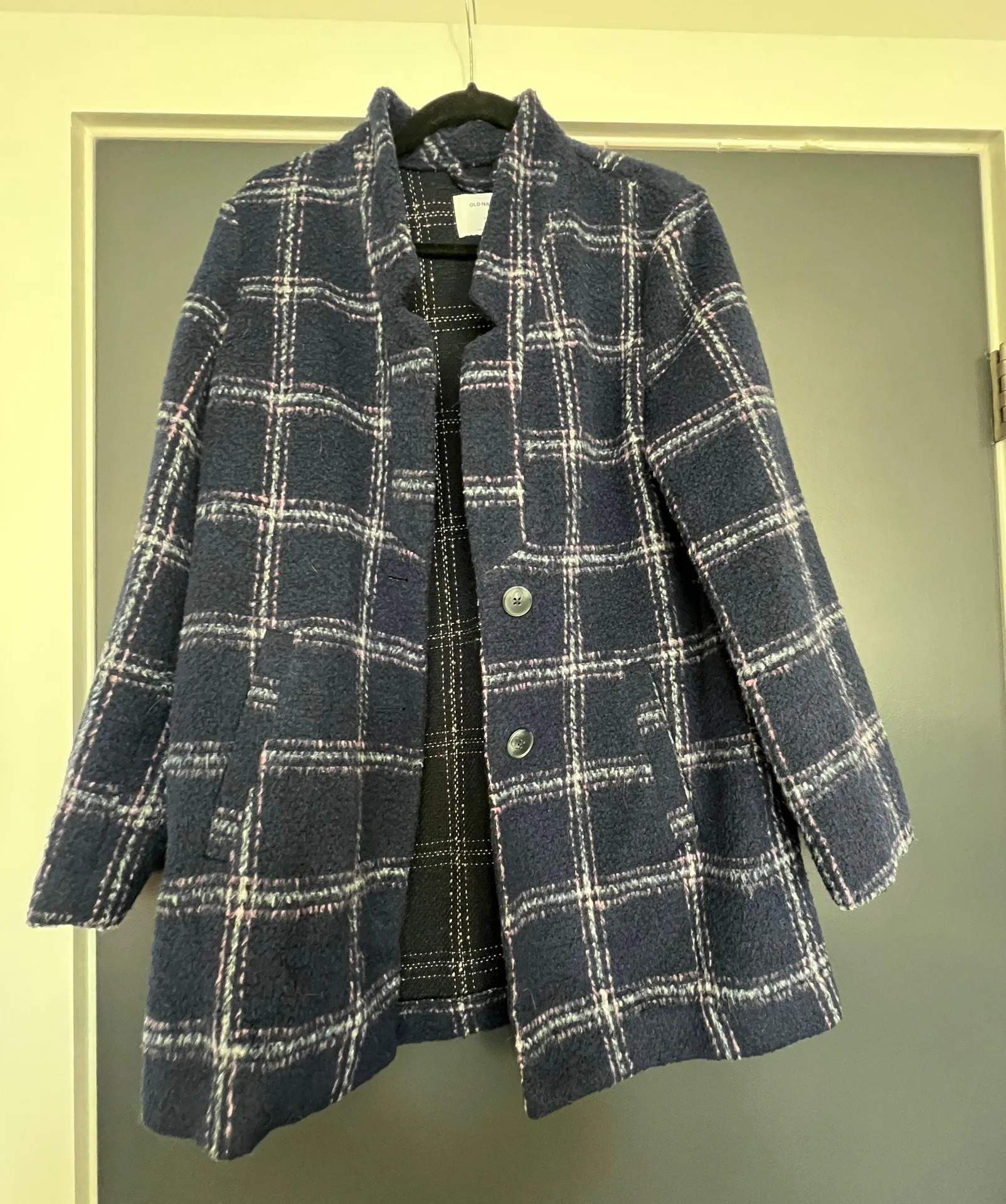 Purple (violet really) plaid peacoat in great condition. Has two buttons and pockets. I am 5’3” and... Show more