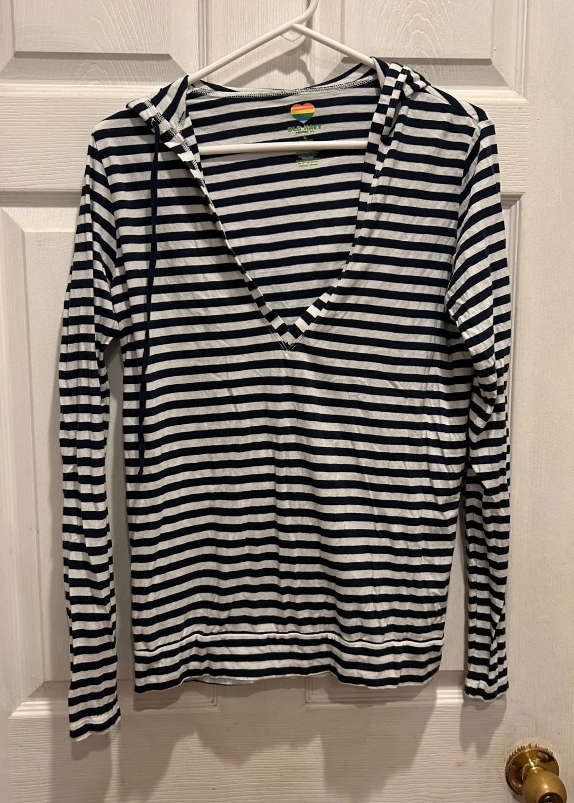 EUC. Blue and white striped hooded t shirt. UA to UA 20" Length 24" Measured flat and approxima... Show more