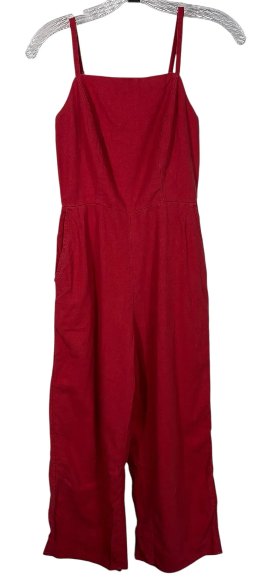 In good condition! Red color in a breathable linen material. Smocked backing adds some stretch. Adju... Show more