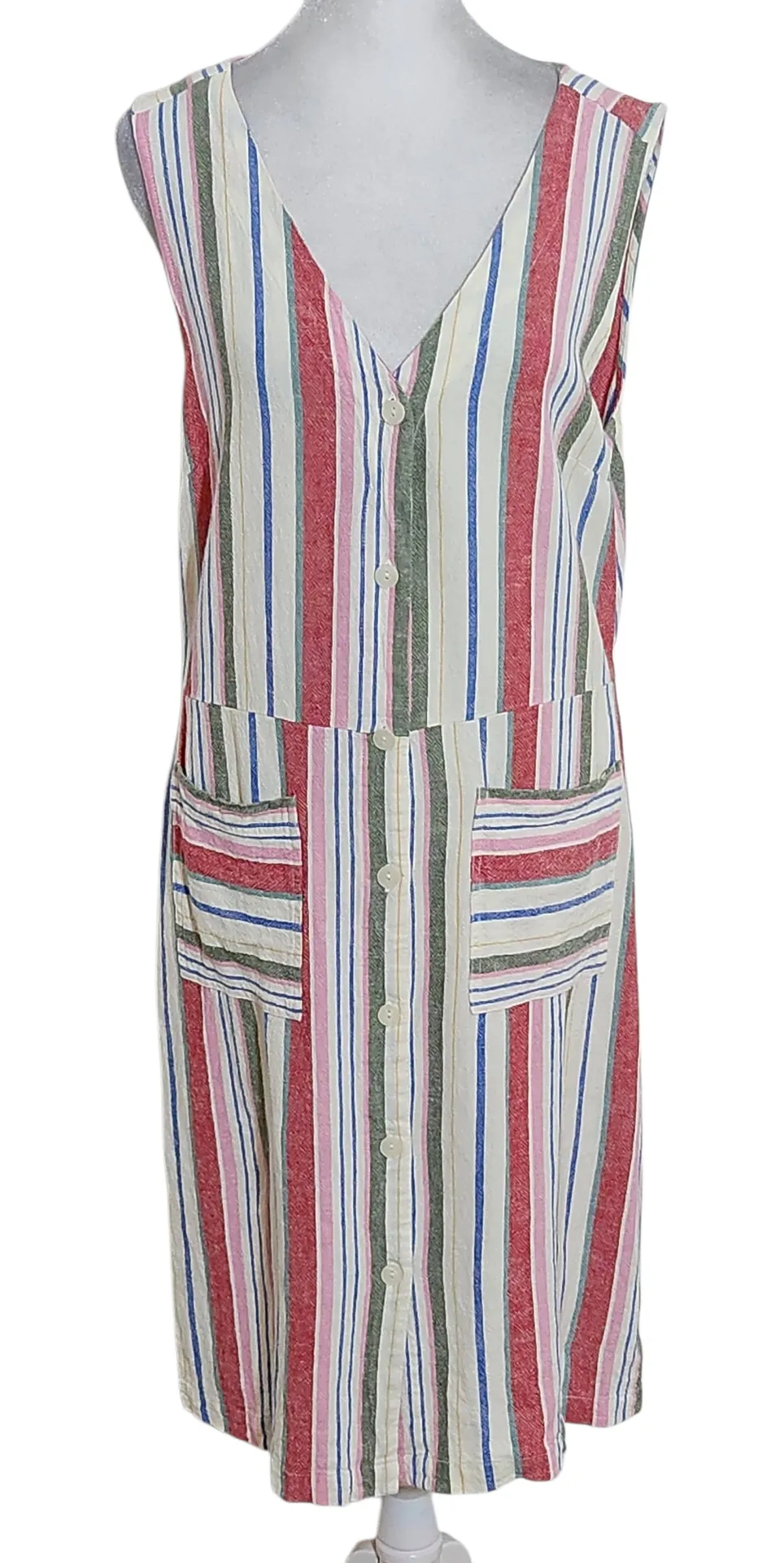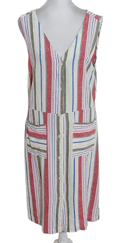 Old Navy preppy sleeeless dress in a linen blend with vibrant stripes in red, pink, blue, and green.... Show more