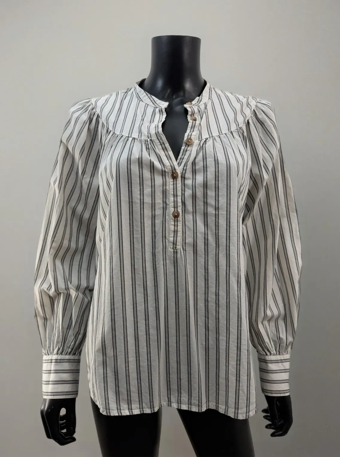Lightweight and breathable Old Navy striped popover blouse in a neutral cream and navy palette. Size... Show more