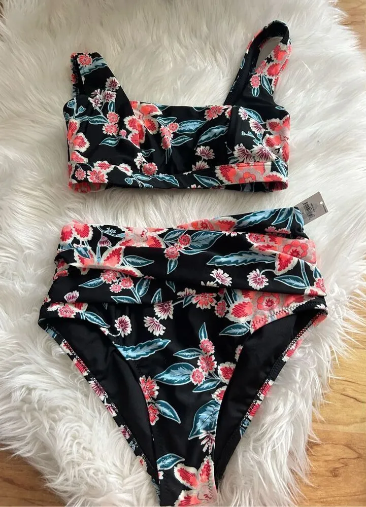 Old navy swim suit black and flowery mommy friendly two piece high rise pads size small