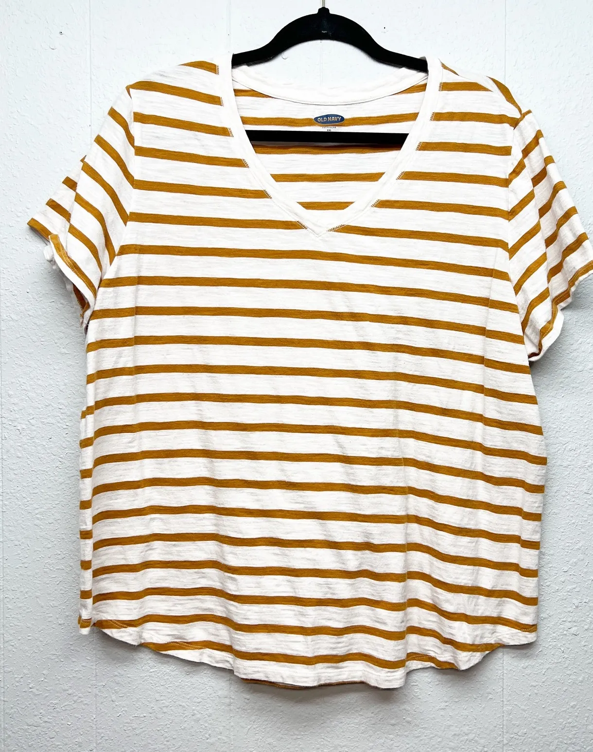 Old Navy women's striped t-shirt. V-neck. Short sleeves. Lightweight & breathable. Has a small stain... Show more