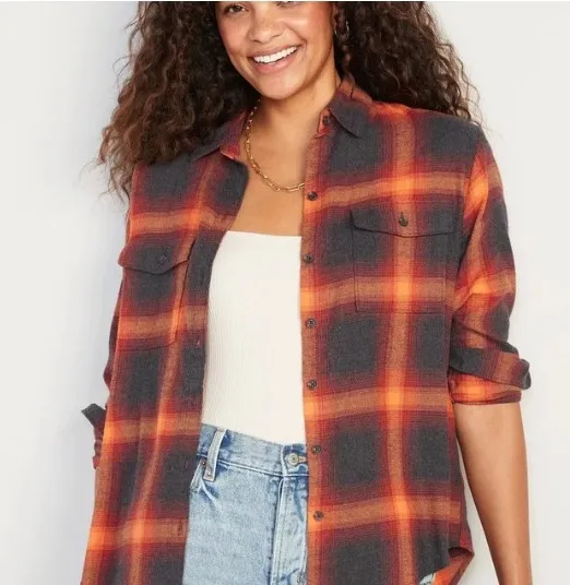 oft and oversized, this Old Navy "Boyfriend Shirt" flannel in orange and black plaid is a closet sta... Show more