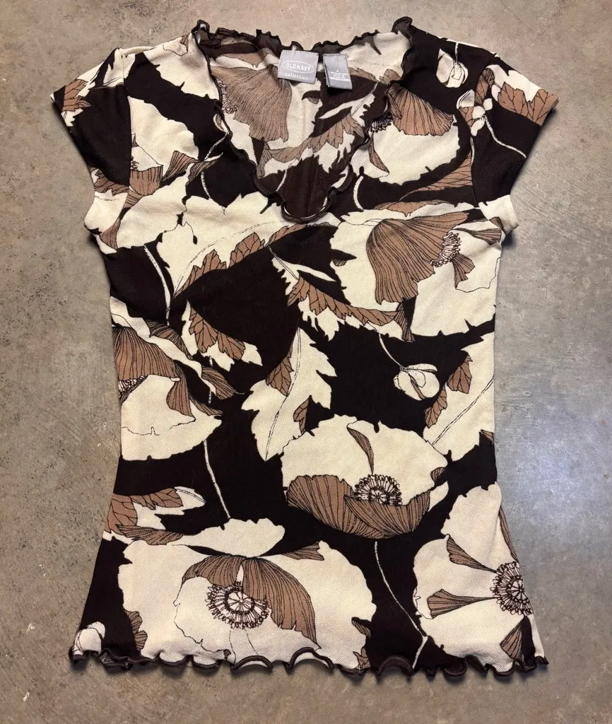Vintage Old Navy Top Womens Y2K Fitted Stretchy Lettuce Trim Brown & Cream top Size: small No noti... Show more